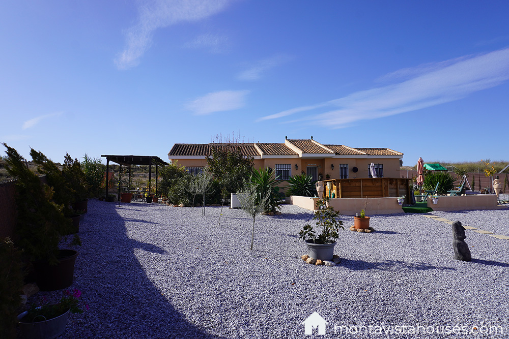 La propiedad tiene 3 dormitorios y 2 baños. Todo está en una sola planta. Se entra por la puerta principal a la espaciosa y encantadora cocina luminosa, al lado hay un comedor y al otro lado un amplio salón con aire acondicionado y estufa de leña.